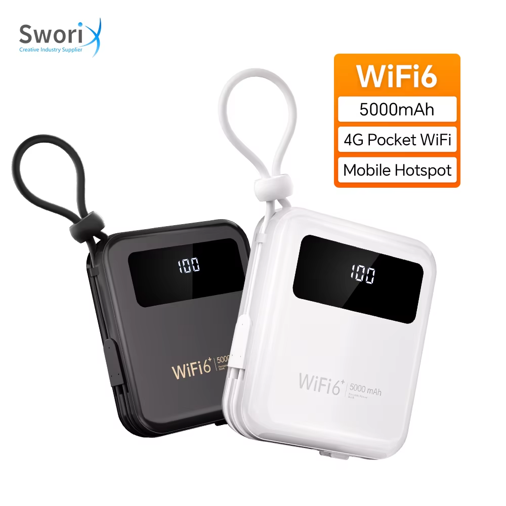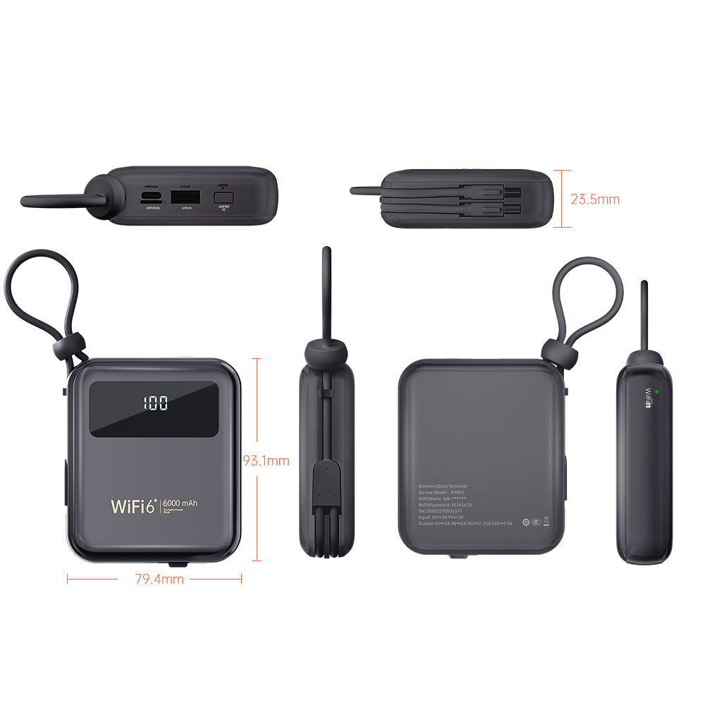 The SW-M6 is a portable MiFi power bank with an integrated LTE Cat.4 module and a 2.4G WiFi6 chip. It supports one physical card slot or three eSIM cards.